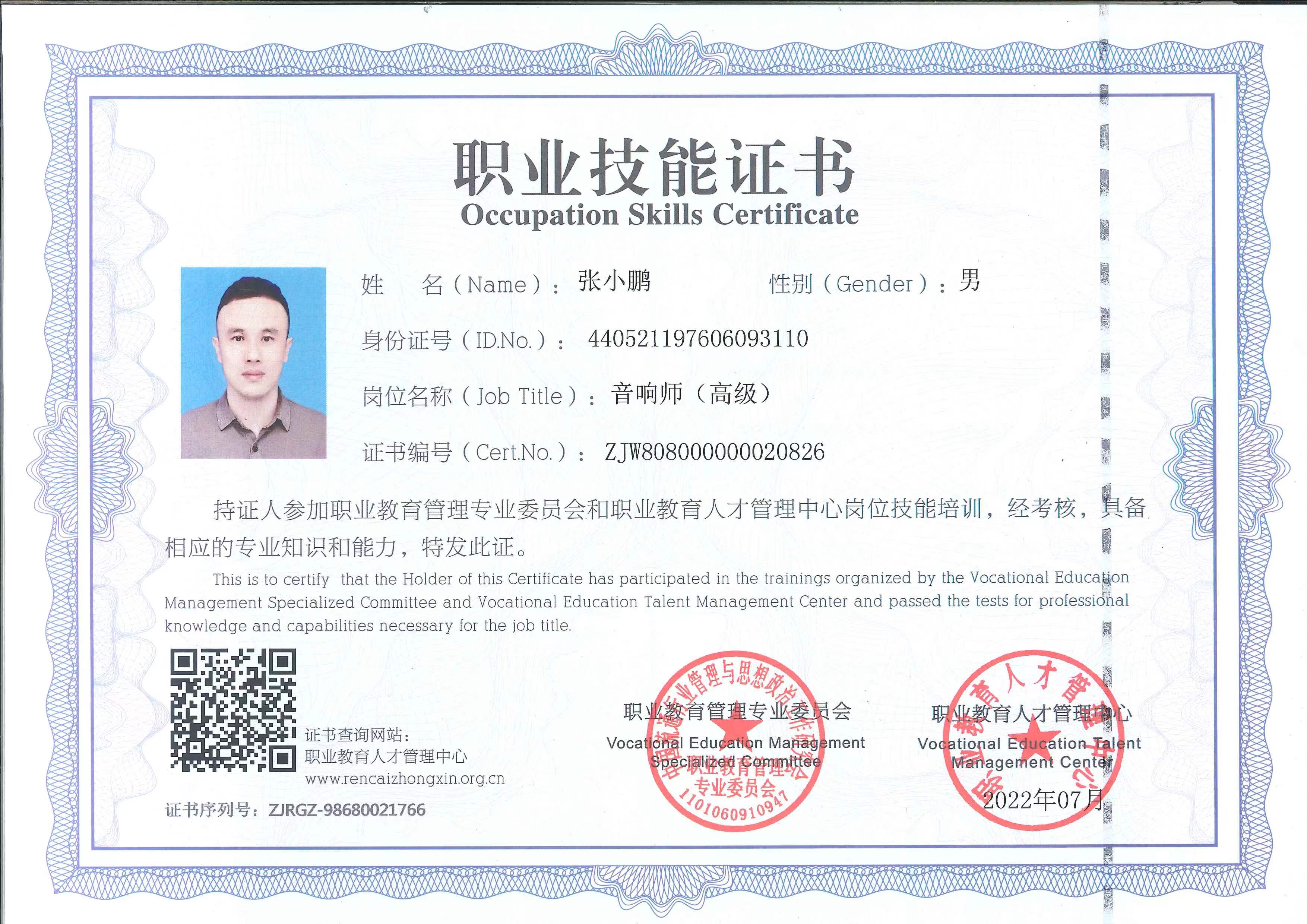 中國錄音師協會認證:專業音響高級調音師